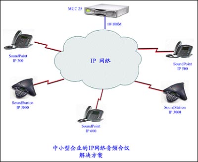 中小型的企业可以采用 MGC 25, 做为IP网络上多方音频会议的音频桥。VoIP音频终端可以采用POLYCOM的专业设备,如:SoundPoint IP300、SoundPoint IP500、SoundPoint IP600、SoundStation IP3000等。 |
